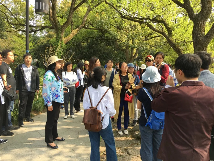 應(yīng)求是老師先帶學(xué)員走進(jìn)花港觀魚,講述花港觀魚公園中的植物配置,首先從植物氣質(zhì)說(shuō)起,香樟婀娜,雞爪槭秀美,不同氣質(zhì)的植物種植在不同區(qū)域的效果,然后講述杭州的植物景觀因大氣候、小氣候的區(qū)別每年都不同,今年可以見到櫻花未落盡,海棠已盛開,晚櫻、桃花、海棠、紫藤等一同時(shí)間都綻放的壯美景觀。