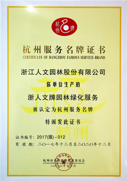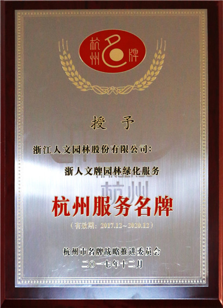 在2017年度杭州名牌產(chǎn)品認(rèn)定中,經(jīng)杭州市名牌戰(zhàn)略推進(jìn)委員會評定,人文園林的園林綠化服務(wù)被光榮評為杭州服務(wù)名牌。