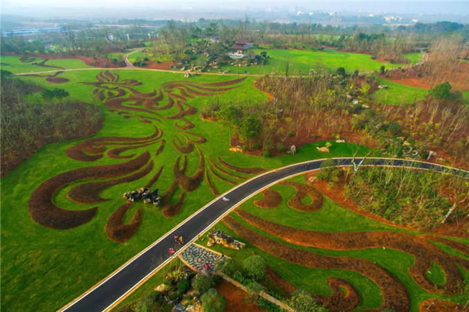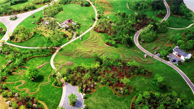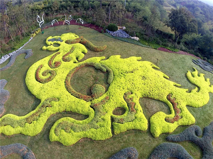 人文園林獨創性的中國特色大地藝術是模紋花壇的大地藝術化,擺脫花壇的束縛,是更大尺度上的大地作畫。同時,大地藝術與模紋花壇最大的不同是,大地藝術不再是園林項目中節點位置的點綴藝術,而是成為主景和畫卷。人文園林因地制宜,以中國文化藝術為底蘊,運用陳勝洪先生多年積累總結的特色植物配置風格,以及獨特的地形營造手法,在大地上作畫,獨創性地進行大地藝術營造實踐,形成獨一無二的“大地立體畫卷”。