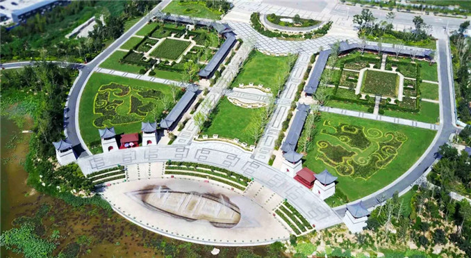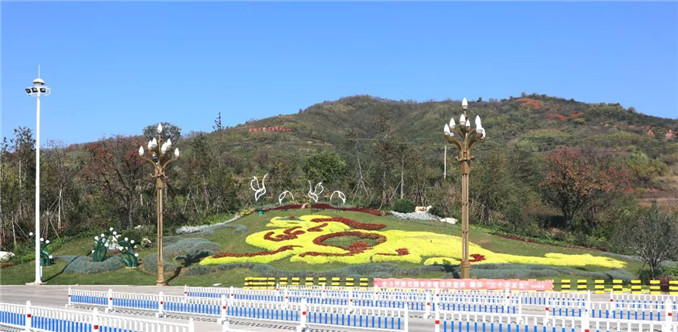 韓城國家文史公園西入口的營造踐行“科藝同構、古今同構、中外同構”的造園理論,在傳統長廊與鼓樓圍合下,用數十品種月季繪成漢代龍鳳圖案,迎接過往游客,也反映了韓城深厚的歷史文化底蘊。