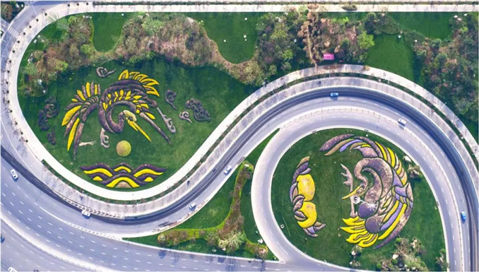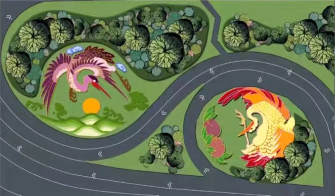 渭南高速公路入口,以多種色彩品種芝櫻為主,搭配佛甲草、火焰南天竹等植物,營造出一對團鶴,名之曰“瑞鶴迎春”。南面(左)仙鶴寓意長壽富貴,千秋萬代;北面(右)仙鶴寓意節節高升,吉祥長壽。