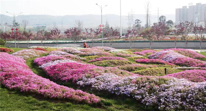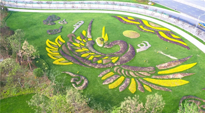 以人文園林特有的植物配置手法,選用抗性強的彩葉植物或觀花植物,組成華麗精致的圖案紋樣。彩葉植物四季有景,觀花植物花開絢爛,組成風格各異的大地畫卷。
