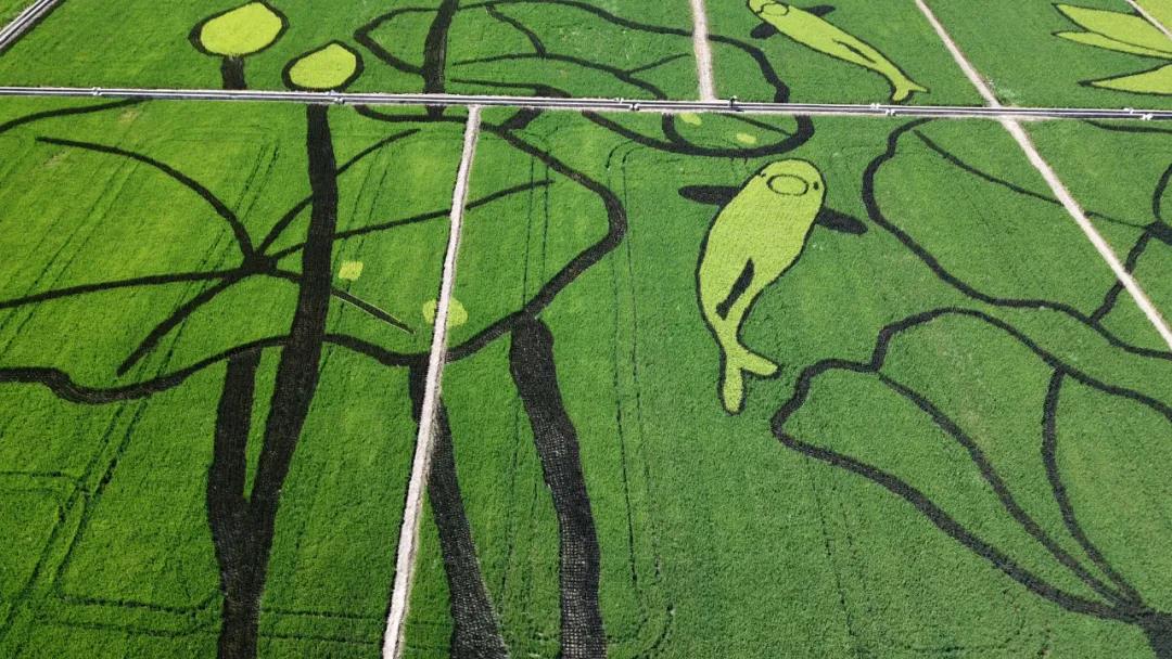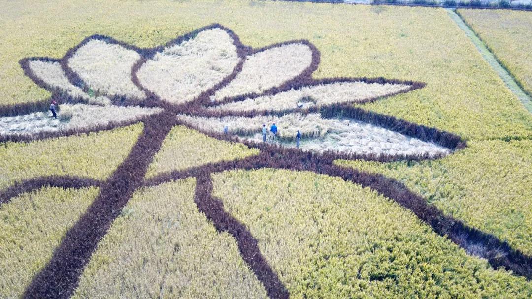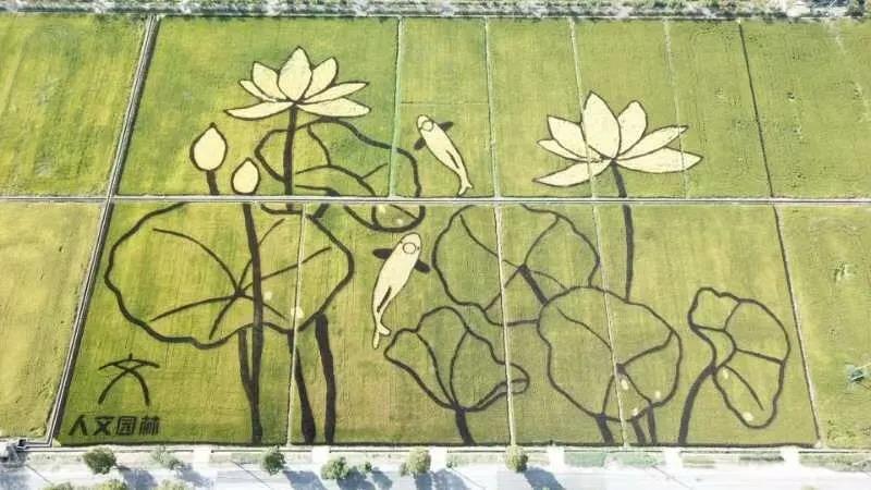 設(shè)計(jì)思路:稻田畫位于杭州西湖西側(cè),因而取荷花與鯉魚的西湖特色元素,據(jù)漢樂府詩《江南可采蓮》描述的意境,通過彩色水稻藝術(shù)化的創(chuàng)作了這副《魚戲蓮葉圖》。《魚戲蓮葉圖》的圖畫中,一對鯉魚像夫妻一樣向上游,逆流而上;兩朵開花的荷花和兩朵未開花的荷包,兩條大鯉魚和六片荷葉,成雙成對的水滴,每一環(huán)節(jié)的設(shè)計(jì)都有“偶”意,荷花與鯉魚同時(shí)象征著連年有余、和和美美的吉祥寓意。“雙花雙蕾雙葉雙魚游,人文人藝人美人心齊。雙浦雙成,人文人才。”,稻田畫用中國傳統(tǒng)水墨畫的方式,彩稻為墨、田為紙,將農(nóng)業(yè)園藝化,大地藝術(shù)化。