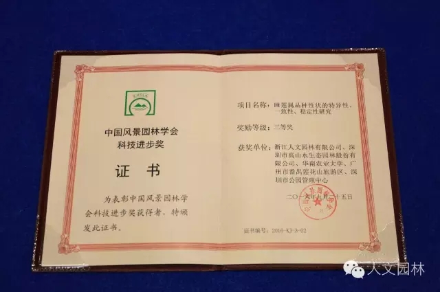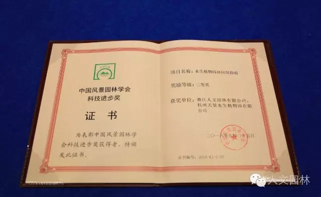 2016年9月23日~26日,2016中國風(fēng)景園林學(xué)會(huì)年會(huì)在廣西南寧隆重召開,并頒發(fā)了2016中國風(fēng)景園林學(xué)會(huì)科技進(jìn)步獎(jiǎng),由浙江人文園林有限公司推出的“人文園林系列叢書”之《水生植物園林應(yīng)用指南》,獲得2016中國風(fēng)景園林學(xué)會(huì)科技進(jìn)步獎(jiǎng)二等獎(jiǎng),浙江人文園林有限公司等單位共同研究的“睡蓮屬品種性狀的特異性、一致性、穩(wěn)定性研究”獲得2016中國風(fēng)景園林學(xué)會(huì)科技進(jìn)步獎(jiǎng)三等獎(jiǎng)。