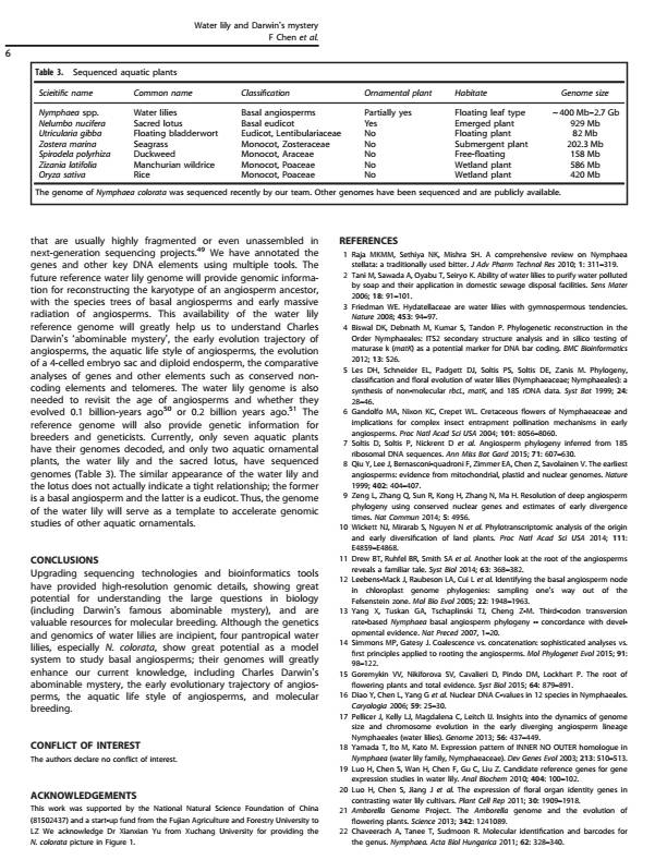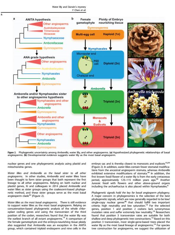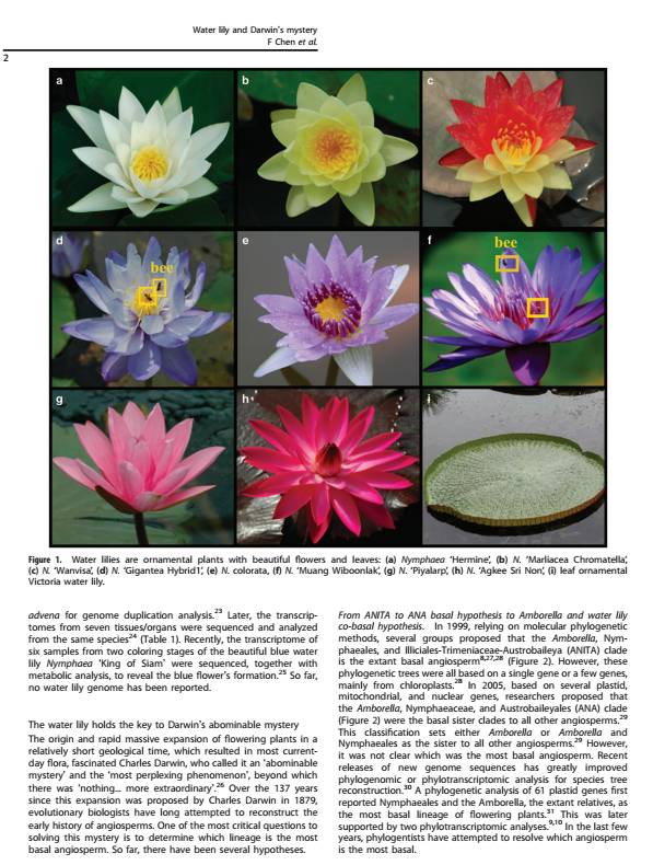 睡蓮基因組對于揭示觀賞性狀的遺傳學極有價值,睡蓮基因組的研究將大大加快睡蓮的分子育種,從而推動睡蓮的應用和產業化。除了觀賞功能,睡蓮還具有重要的文化和經濟價值,而且占據了開花植物起源和早期進化的關鍵位置。開花植物的誕生和快速輻射吸引了許多科學家,并被查爾斯·達爾文認為是“可惡的奧秘”。該綜述回顧了睡蓮當前的分子研究現狀,并提出睡蓮研究進入基因組時代。該文提出,睡蓮的基因組是研究基部被子植物與達爾文“可惡的奧秘”有爭議的關系的關鍵。四種廣熱帶睡蓮中特別是近期張亮生教授領銜測序的藍星睡蓮,具有體量小,生長快,種子多等特點,可作為研究被子植物來源的最佳模式物種。